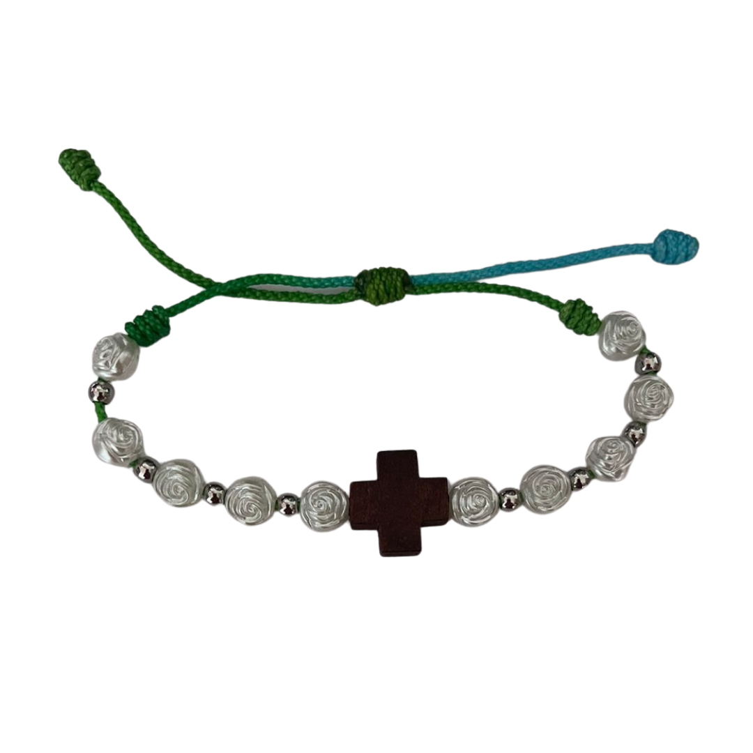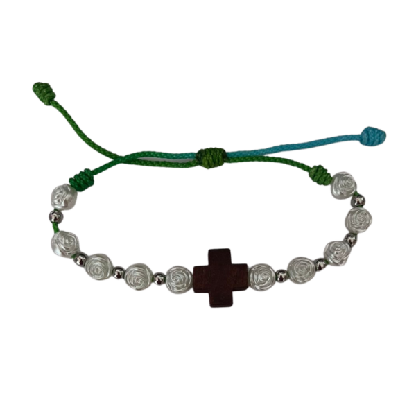 COLORES: Este denario esta disponible en color blanco cada cuenta en forma de rosa y el hilo o terlenca de color amarillo, negro, azul, verde, dorado y cafe segun lo quieras combinar.